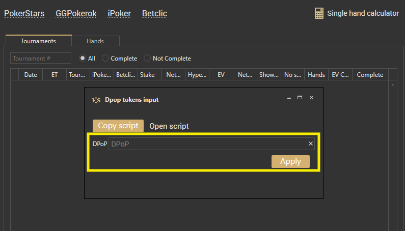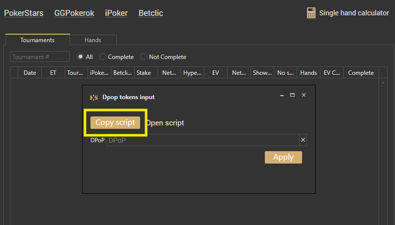 9. You will see a new window “DPoP tokens input”. Click Copy Script again.