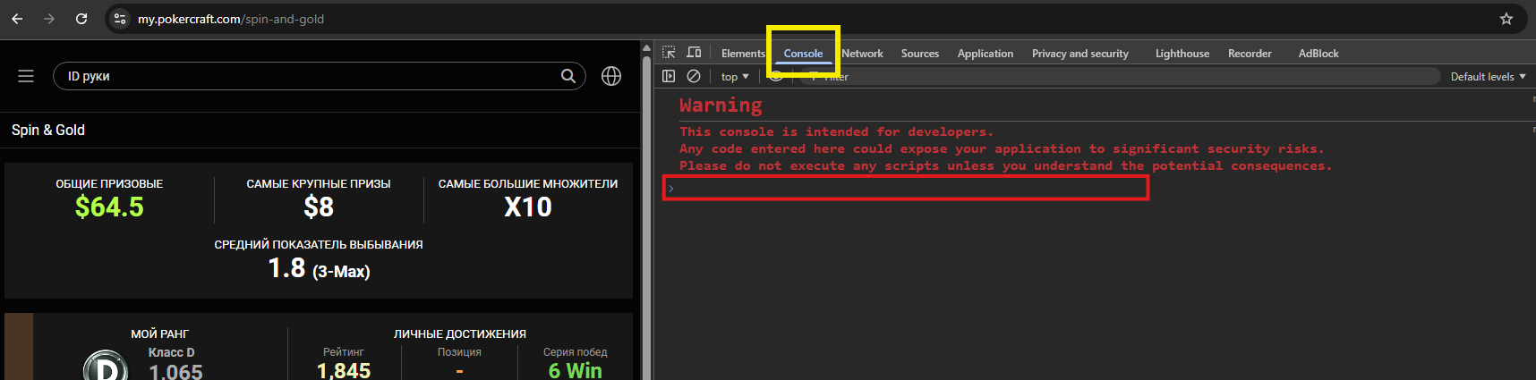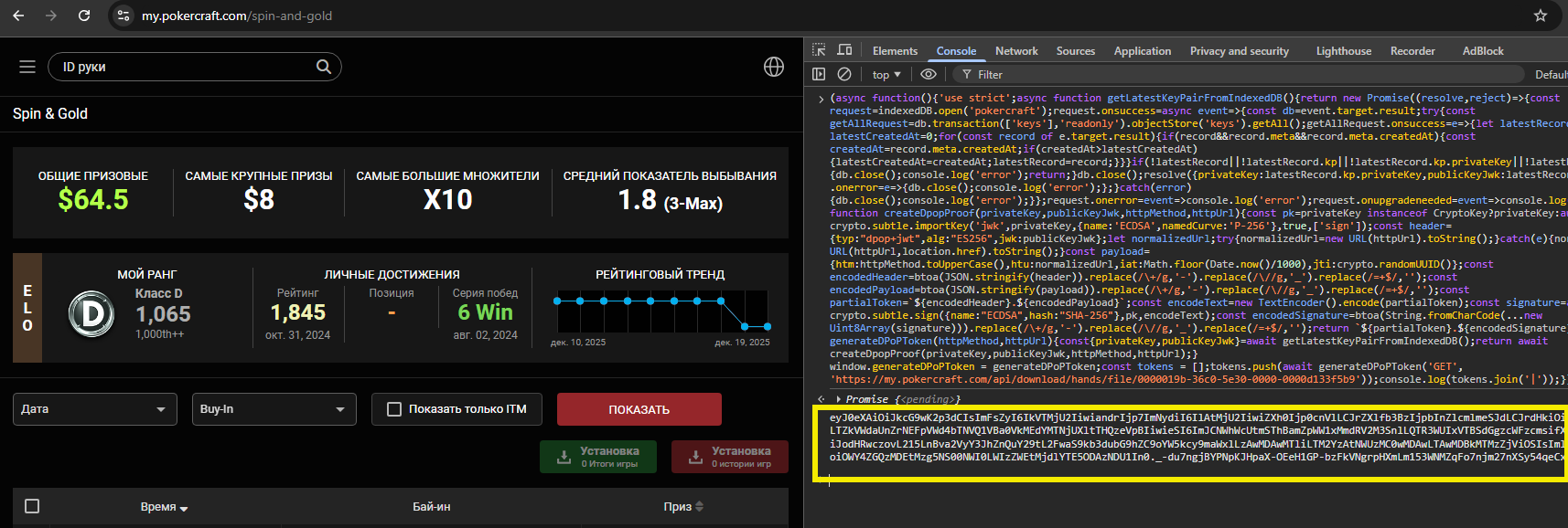 3. In PokerCraft, go to the Spin & Gold page (or simply refresh the page). In the Developer Tools, in the Name column, click on “SpinAndGold?from=…”, find the authorization line, and copy it starting from Bearer.