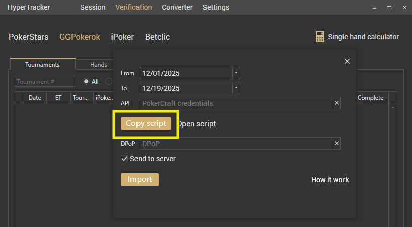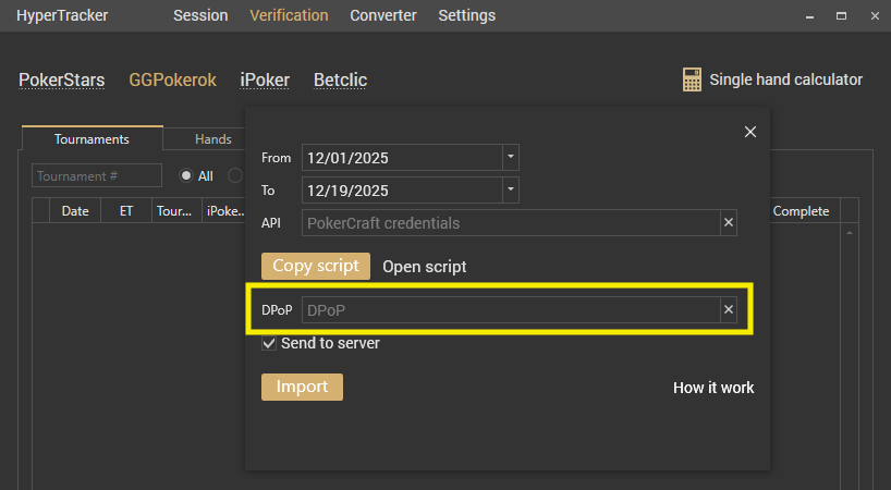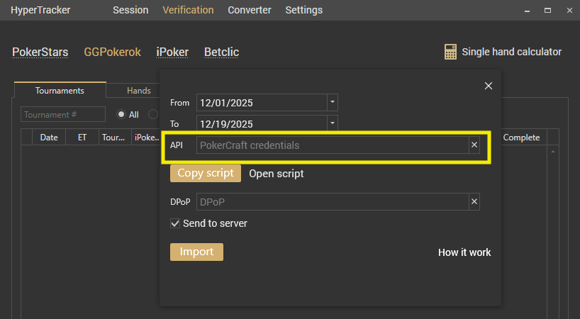 4. Open Hypertracker and go to Verification → GGPoker. Select the dates and paste the authorization code into the API field.