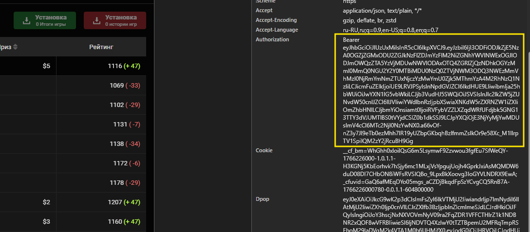 6) В Pokercraft переходим на страницу Spin&Gold (либо просто перезагружаем страницу). В панели разработчика в окне Name нажимаем на “SpinAndGold?from=....”, находим строку autorization и копируем её, начиная с Bearer.